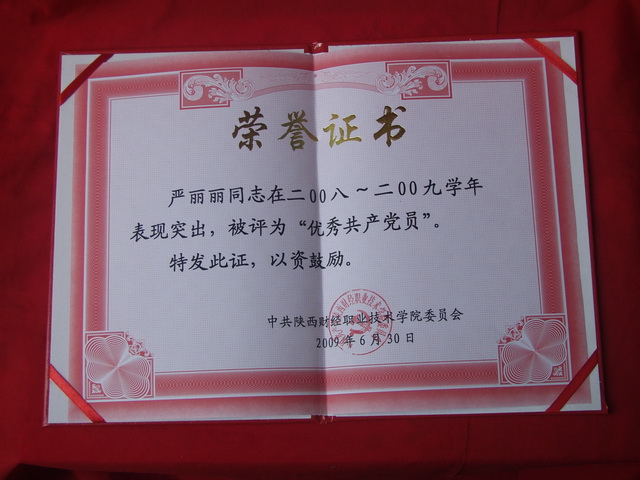 严丽丽被学院党委评为2008—2009年度“优秀共产党”