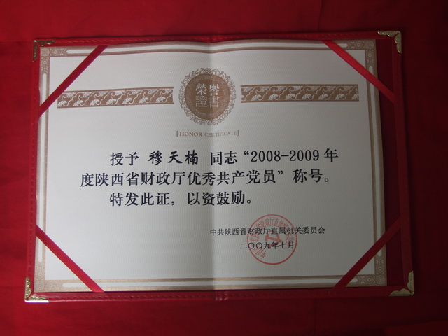 穆天楠被省财政厅直属机关评为2008—2009年度“优秀共产党…