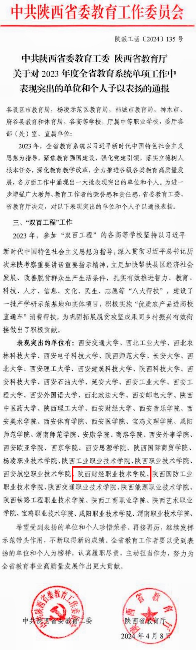 4月8日,中共陕西省委教育工委、陕西省教育厅发布《关于对2023年度全省教育系统单项工作中表现突出的单位和个人予以表扬的通报》(陕教工函[2024]135号),全省共有53所高校获得“双百工程”先进单位,我校名列其中,这是我校连续7年获此殊荣。